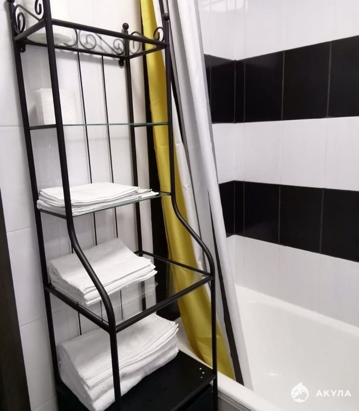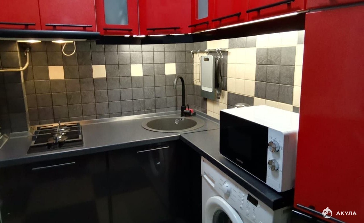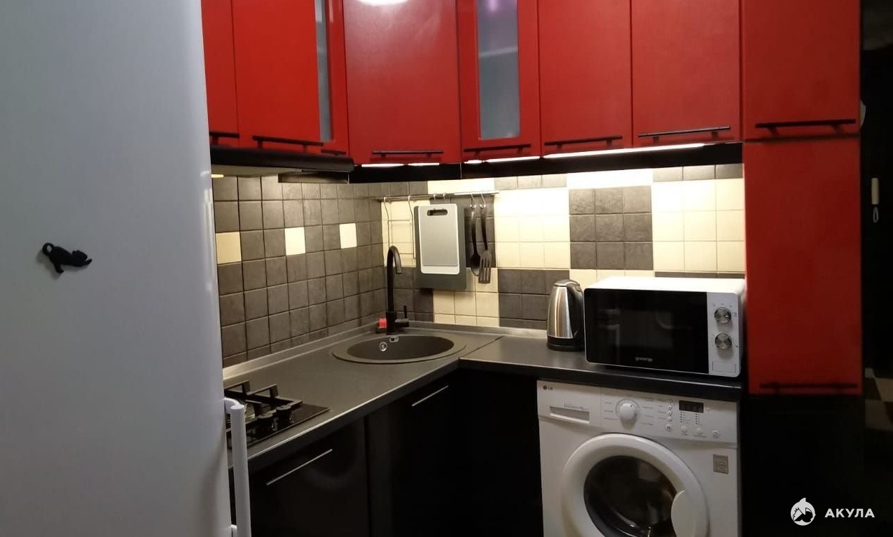 Полностью оборудованная кухня: холодильник, плита с 4 конфорками, духовка, микроволновка, электрический чайник, небольшой набор посуды.